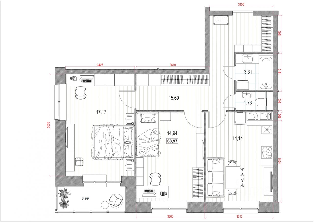 В квартирах высокие потолки от 2,8 до 3 метров. Все балконы застеклены. Будут выполнены самые грязные и тяжелые работы: заливка полусухой стяжки вместе со слоем керамзита для тепло- и звукоизоляции, установка межкомнатных стен.