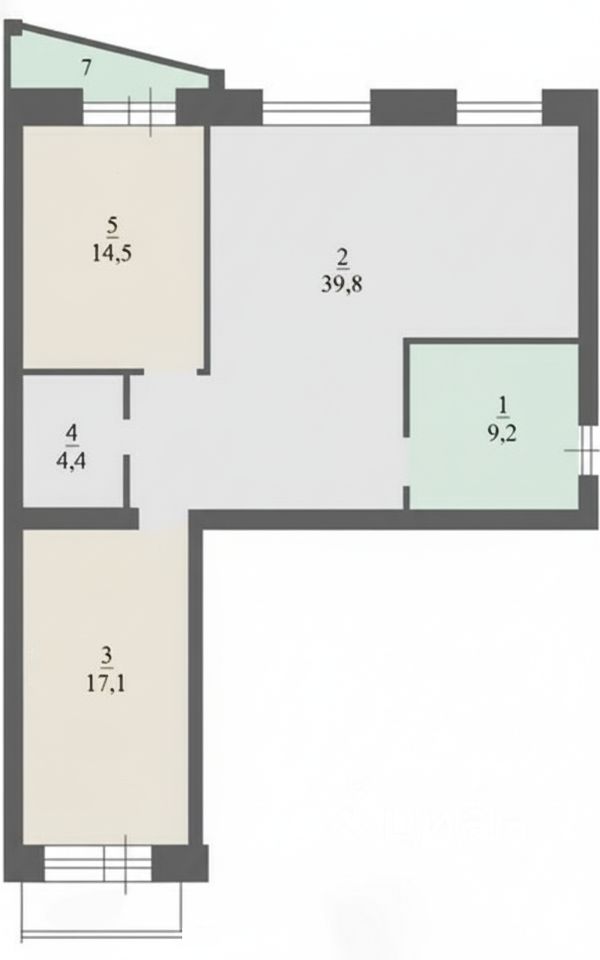 *В квартире просторная кухня-гостиная и две раздельные комнаты на разные стороны дома.