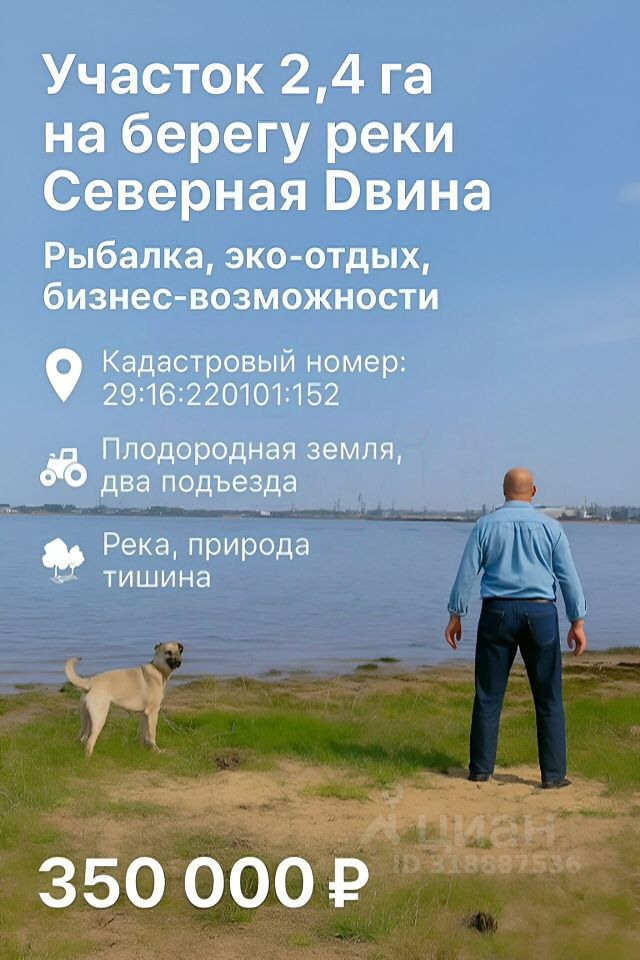 Участок 2,4 га на берегу реки Северная Двина | Рыбалка, эко-отдых, бизнес-возможности.