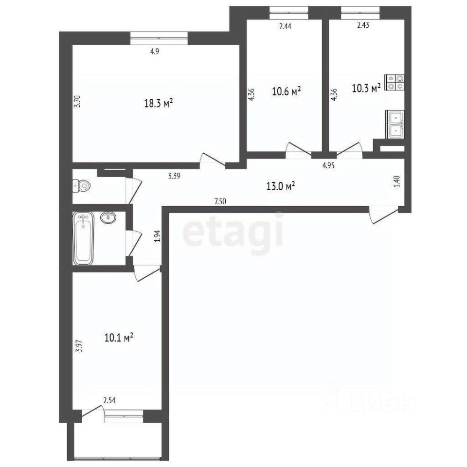 Все комнаты раздельные. Окна выходят на разные стороны дома. На кухне, площадью 10,3 кв.м, есть возможность удобно разместить обеденную группу и рабочую зону. Большой коридор позволяет организовать систему хранения. Санузел раздельный.