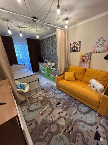 В квартире остается мебель: комната - двухспальная кровать, шкаф-купе, комод, кухня - небольшой кухонный гарнитур, стол+два металлических стула, холодильник, газовая плита, санузел - водонагреватель.