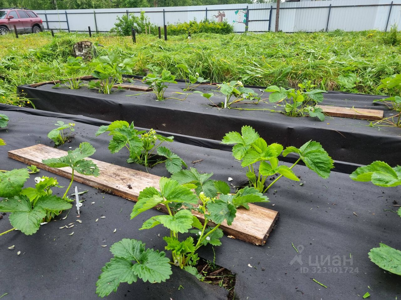 Есть кусты чёрной, красной и белой смородины. Высажена клубника.