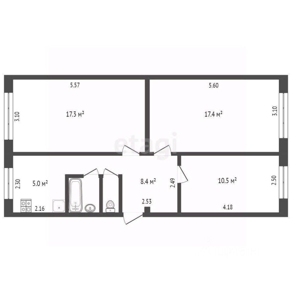 Удобная планировка: все комнаты раздельные (площадь 17,3, 17,4 и 10.5 кв/м). Окна на разные стороны. Большой квадратный коридор, в котором можно разумно разместить зону для хранения. Санузел раздельный.