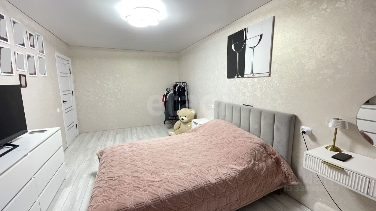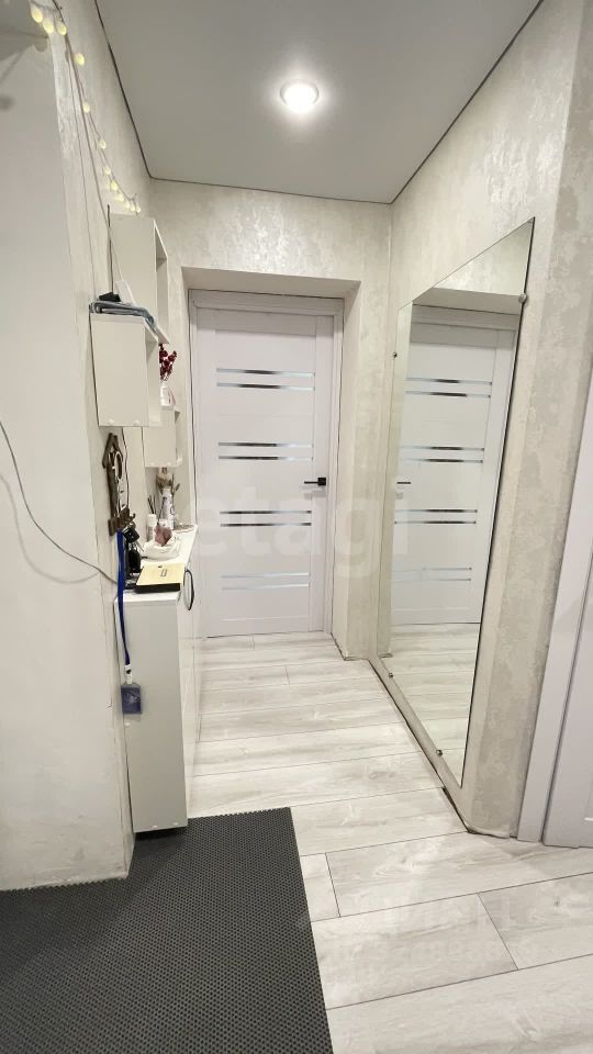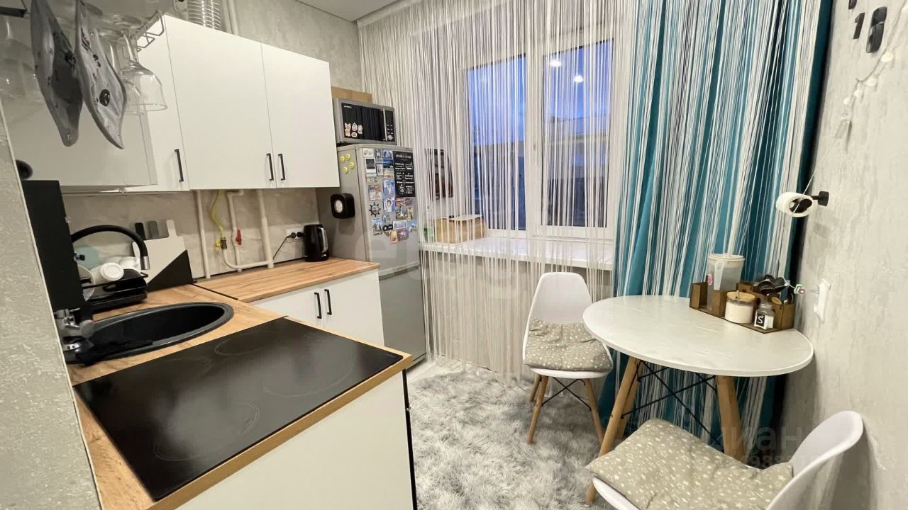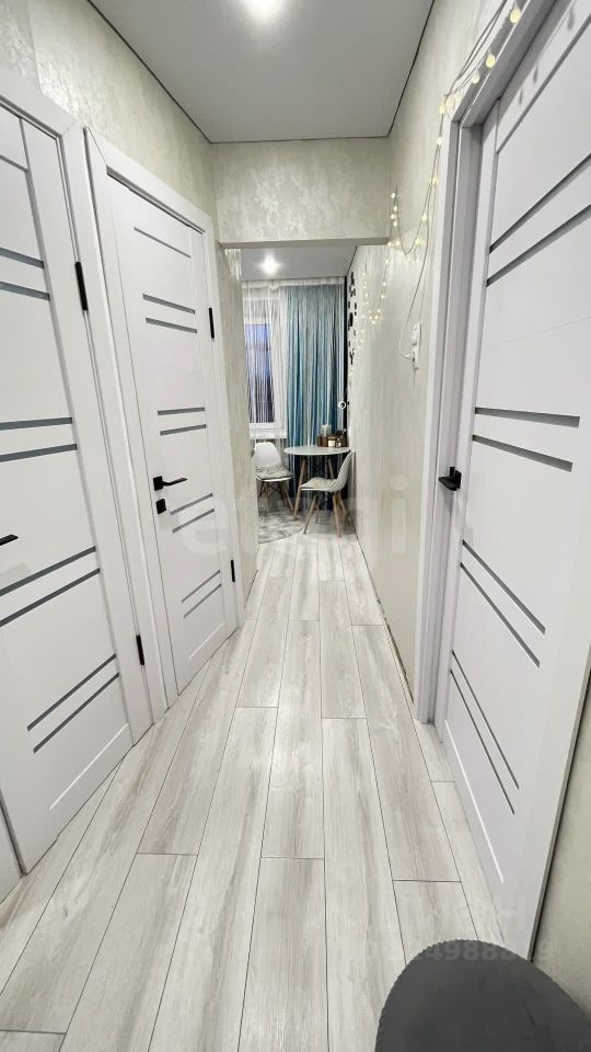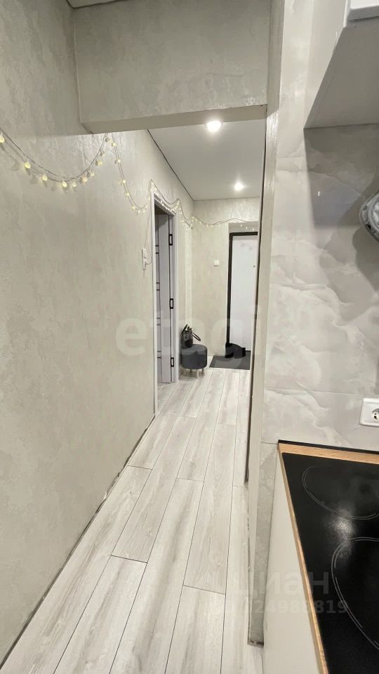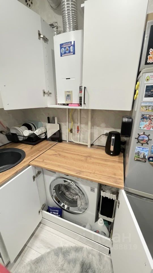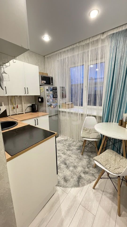 На полу светлый ламинат, натяжной потолок с ярким светом. Новый кухонный угловой гарнитур, встроенная стиральная машина и холодильник остается при продажи.