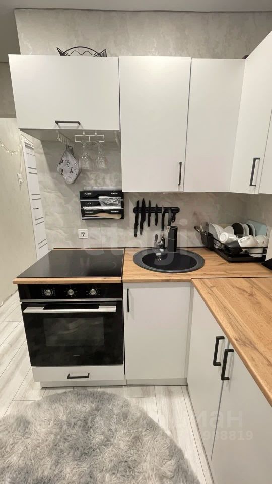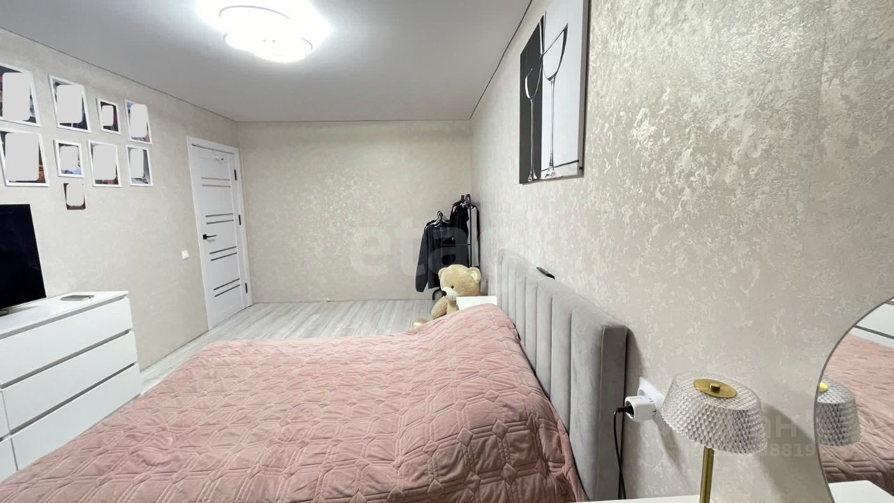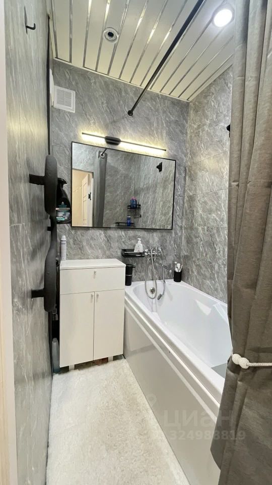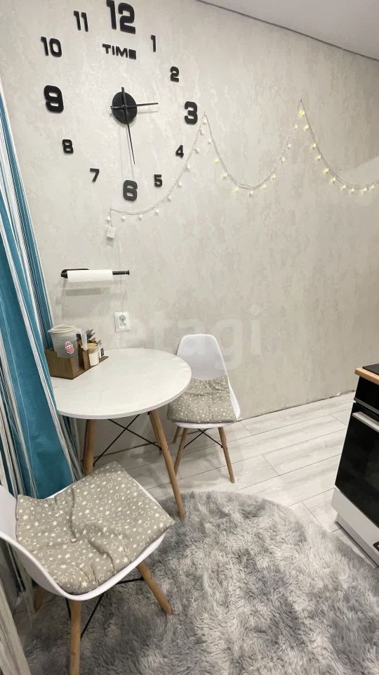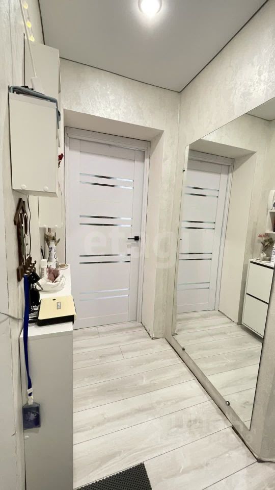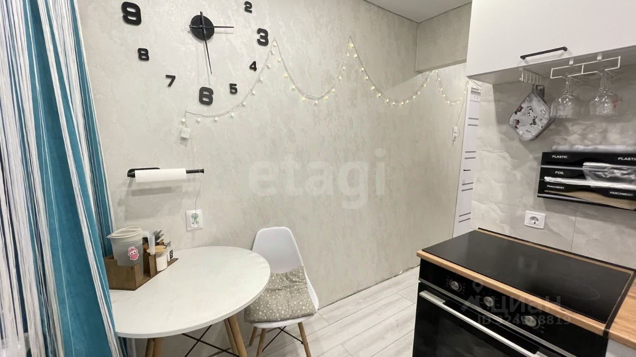 На полу светлый ламинат, натяжной потолок с ярким светом. Новый кухонный угловой гарнитур, встроенная стиральная машина и холодильник остается при продажи.