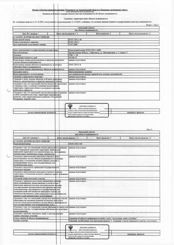 Земельный участок общей площадью 2708 кв. м, кадастровый номер 29:05:130111:83, категория земель - земли населенных пунктов, вид разрешенного использования - для строительства группы гаражей, постройки и сооружения отсутствуют. адрес: Архангельская обл., г. Каргополь, ул. Мелиораторов, д. 5, корп. 5 1 Штука (шт)