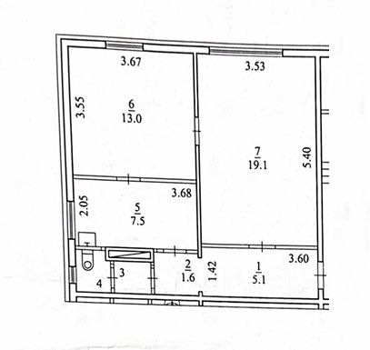 Общая площадь 48,5 м2. Комнаты раздельные 19,1 и 13 м2. Кухня 7,5 м2. Совмещенный санузел. Окна выходят во двор. Во всей квартире установлены новые радиаторы отопления.