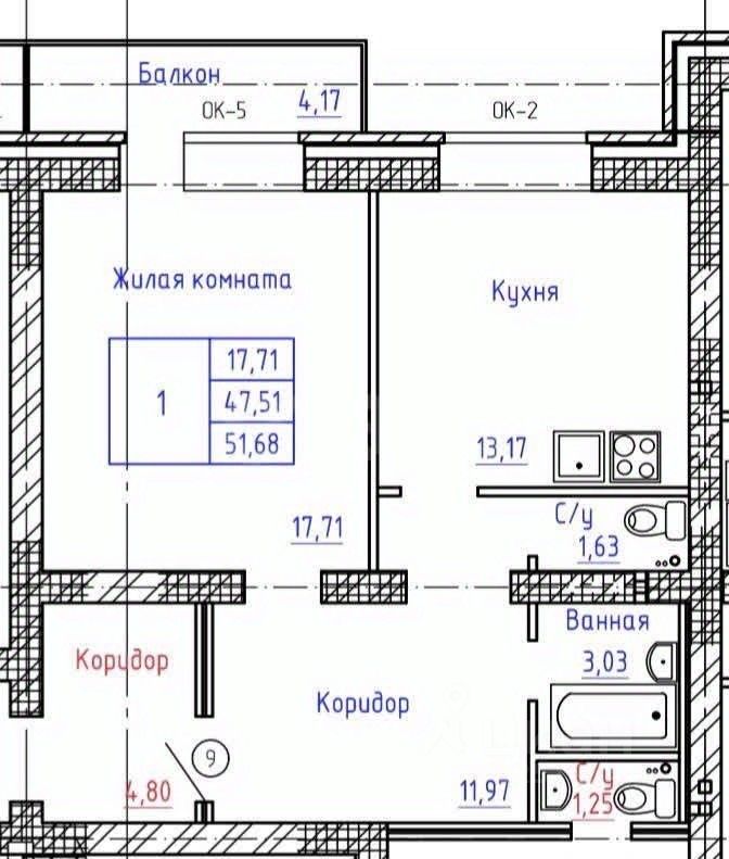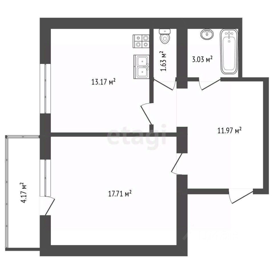 Однокомнатная квартира площадью 51,68 м² расположена в современном кирпичном доме на Левом Берегу Архангельска.