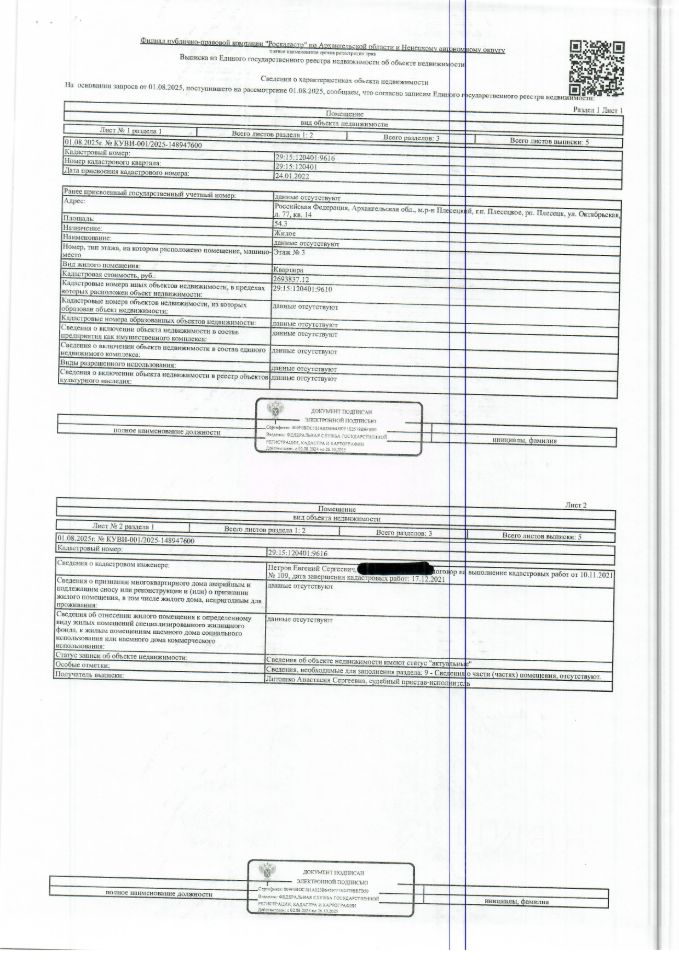 Данные получены с сайта ГИС Торги. Жилое помещение (квартира) общей площадью 54,3 кв. м, кадастровый номер: 29:15:120401:9616, адрес: Архангельская обл., м.р-н Плесецкий, г.п. Плесецкое, рп. Плесецк, ул. Октябрьская, д. 77, кв. 14 1 Штука (шт)
