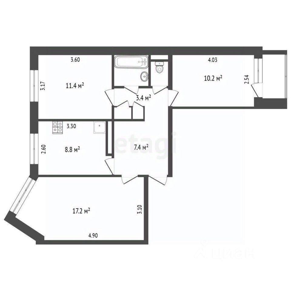 Дом 5-этажный, панельный, 93 серии. Планировка (все комнаты изолированные): * Гостиная — 17,2 кв. м * Комнаты — 11,4 кв. м, 10,2 кв. м (с выходом на застекленную лоджию) * Кухня — 8,8 кв. м * Прихожая — 10,8 кв. м (несколько встроенных шкафов) * Раздельный санузел