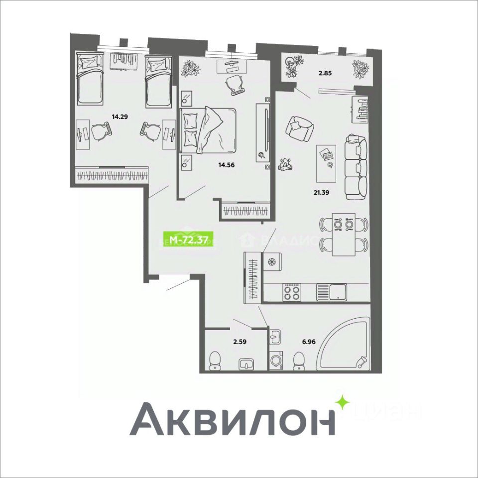 Квартира располагается на 4 этаже 4-этажного кирпично-монолитного дома. Общая площадь квартиры - 72,37 м². Две комнаты площадью 14,56 м² и 14,29 м², кухня-гостиная - 21,39 м². В кухне-гостиной есть место для установки камина. Высокие потолки 3м. Окна выходят на Обводный канал. Квартира сдается без отделки, свободной планировки. CITY RESIDENCE by AKVILON - проект Группы Аквилон рядом с ТЦ ''Титан-Арена''. Камерная резиденция бизнес-класса — это по-настоящему редкое предложение для тех, кто стремится к приватности и личному комфорту, оставаясь в самом центре городской жизни. Преимущества: • ''Умная'' система inHOME 3.0 • Концепция Termo-S, • Современные бесшумные лифты с увеличенной кабиной • Многокамерные стеклопакеты Energy ligh со скрытой фурнитурой и декоративной ламинацией со стороны квартиры • На лоджии есть место для установки кондиционера • Улучшенная шумоизоляция: полы с дополнительным слоем и стяжкой не менее 5 см, трехслойная шумоизоляция межквартирных перегородок • Хорошая качественная дверь • Дизайн выполнен ведущим международным архитектурным бюро MLA+ • Благоустроенный закрытый двор