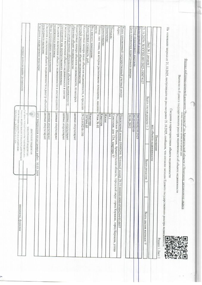 Данные получены с сайта ГИС Торги. Жилое помещение (квартира) общей площадью 44,1 кв.м, кадастровый номер 29:23:010210:2523, Адрес: Архангельская обл., г. Коряжма, ул. Советская, д. 12А, кв. 37 1 Штука (шт)