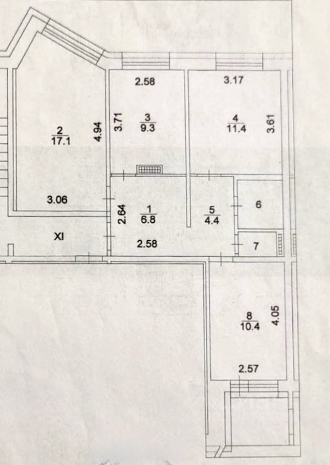 Площади квартиры: 63,3/38,9(17,1+11,4+10,4) кв.м, кухня - 9,3 кв.м, комнаты раздельные, окна выходят на разные стороны дома (распашная планировка), высота потолков 2,90 м, имеется лоджия.